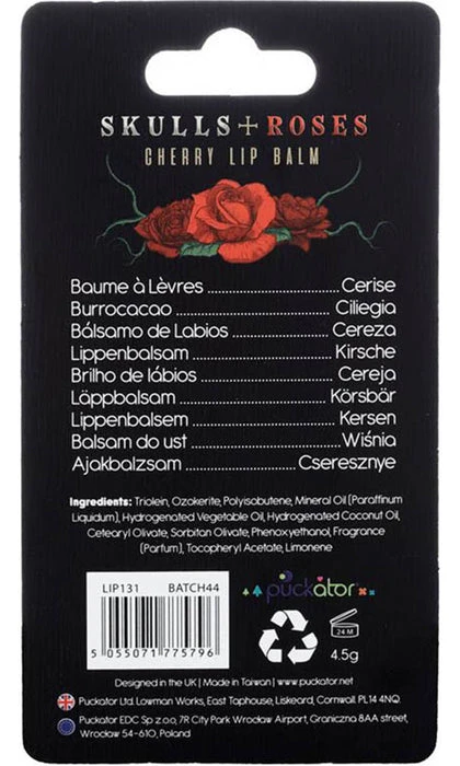 Keep your lips in tip top shape with these adorable and deliciously scented Skulls & Roses Cherry Lip Balm.