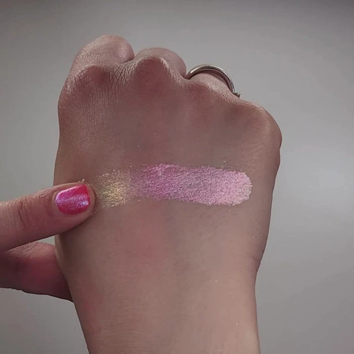Multichrome with a sparkly finish and a translucent base that shifts from red, pink, orange, gold to light green.