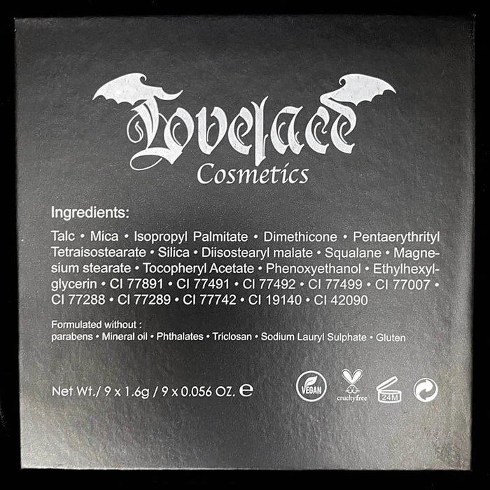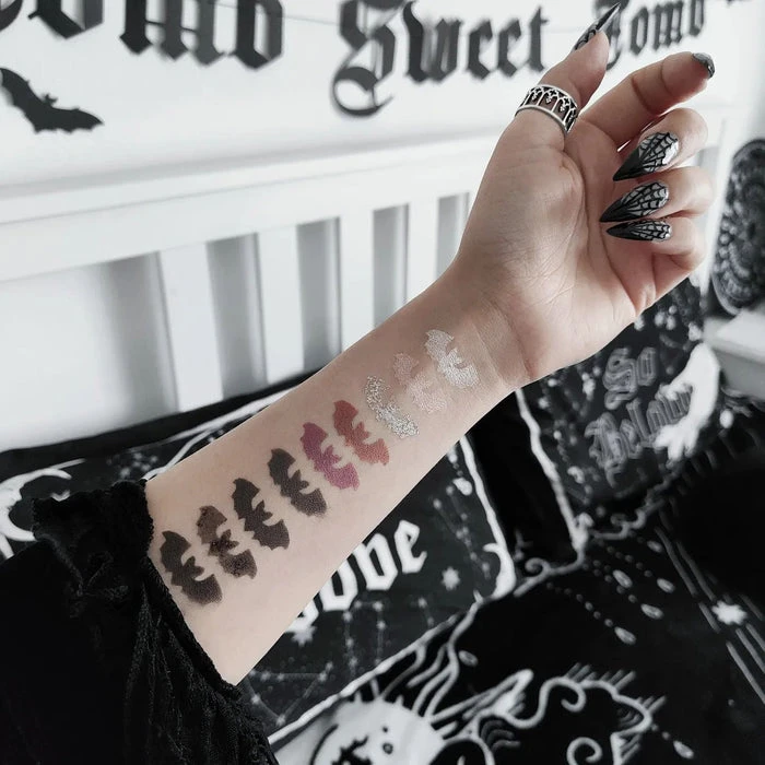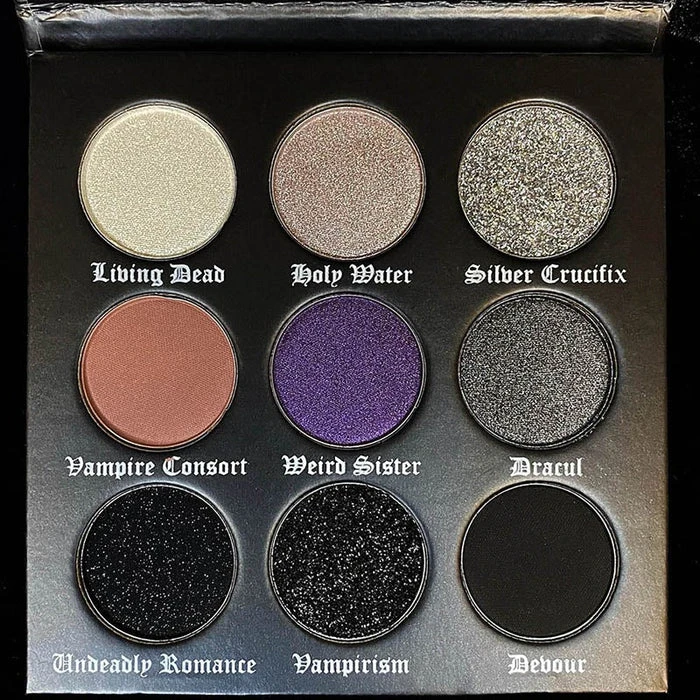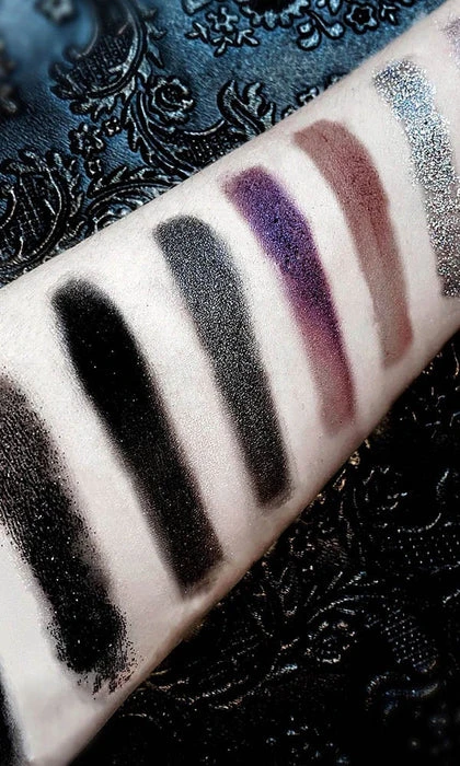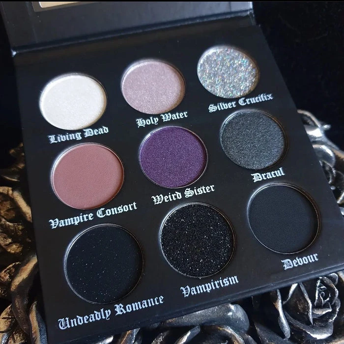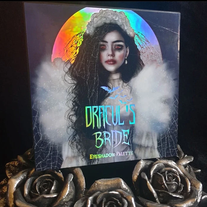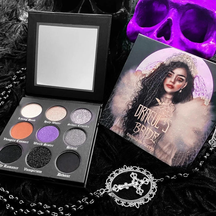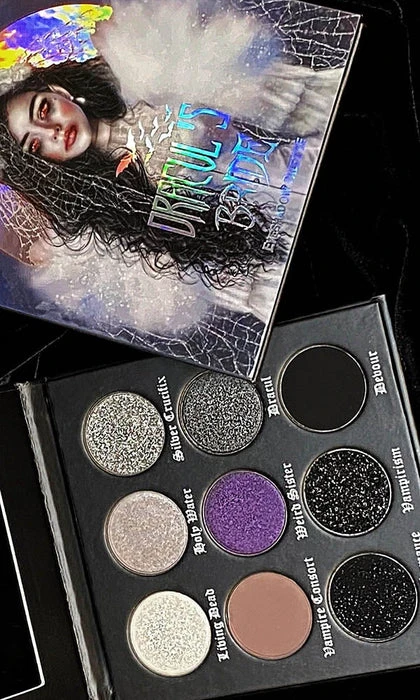 Dracul’s Bride Eyeshadow Palette has 9 high pigmented grey scaled matte, shimmers and glittery bold colors inspired by the vampire folklore of Dracula’s bride mixed with some part of my own life story. It’s a fully vegan, gluten and cruelty free GOTHIC palette!