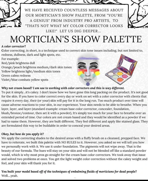 Looking to bring your makeup routine back to life? This Colour Correcting Morticians Show Palette from LunatiCK Cosmetic Labs will do just that! The hues themselves were inspired using classic techniques of morticians. The shades were inspired by the embalming solutions used to tastefully enhance the deceased.