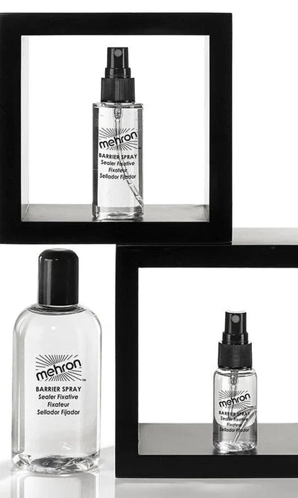 Mehron’s Barrier Spray™ is a clear liquid spray that sets makeup designs and helps protect sensitive skin from makeup, latex and other adhesives. Great for extending the wear of makeup applications for Modeling, TV, Stage, Clowning, Face Painting, Halloween, Special Effects and Photography!