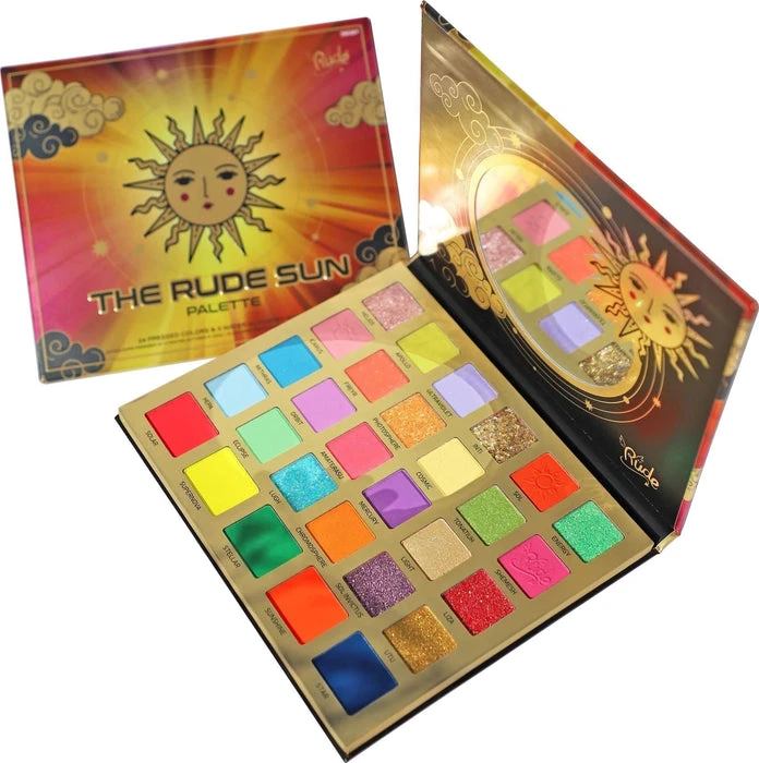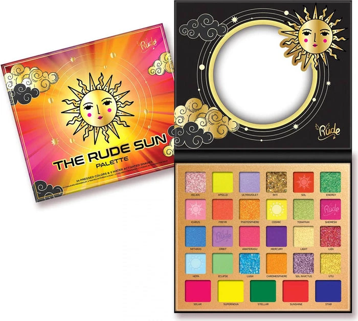 Take an orbit around the Rude Sun palette to explore its entire color spectrum. This sun palette includes 5 innovative water activated neon shades and 24 matte and glimmer hues.